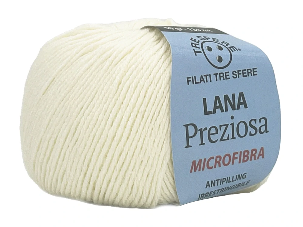 Priadza Lana Preziosa od talianskeho výrobcu Filati Tre Sfere je vyrobená zo 100 % akrylového mikrovlákna. Je to nekrčivé, hladké a jemné mikrovlákno, má protižmolkovú (antipillingovú) úpravu. Ľahko sa s ňou pracuje. Je vhodná na celoročné projekty.